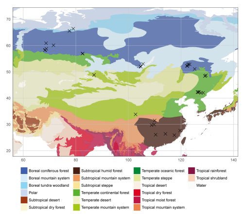 该成果是一项国际合作研究,论文第一作者和通讯作者为我校秦养民老师,第一作者单位为金沙js4399首页和关键带演化湖北省重点实验室。参加者来自中国地质大学(武汉)、东北师范大学、莫斯科大学、俄罗斯科学院气候变化和生态系统西伯利亚监测站,以及约克大学等十多个科研机构。该研究历时约十余年,收集了亚洲地区东起勘察加半岛-远东地区和兴安岭-长白山区一线,西至贝加尔湖-西西伯利亚的广大地区,北起亚北极圈,南至中国南方亚高山湿地群,采集样品近3000余份,覆盖了亚洲泥炭湿地的大部分区域(图1)。