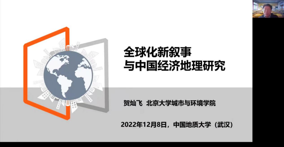 12月8日,应金沙js4399首页王绍强、王伦澈教授邀请,北京大学城市与环境学院院长贺灿飞教授做客中国地质大学(武汉)第111期名家论坛暨校庆七十周年学术交流会,以线上形式作题为“全球化叙事与中国经济地理研究”的学术报告,受到师生的广泛欢迎。报告由王绍强教授主持,线上、线下与会人数共计逾200人。