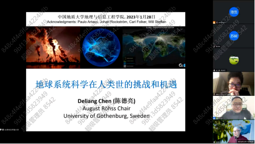 2023年1月30日,应王伦澈教授邀请,瑞典哥德堡大学陈德亮院士做客中国地质大学(武汉)名家论坛(第2023-02期),以线上形式作题为“地球系统科学在人类世的挑战和机遇”的学术报告,受到广大师生的热烈欢迎。报告由副校长王力哲教授主持,线上与会人员900余人。