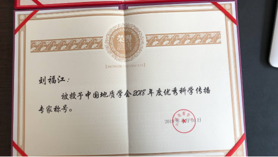祝贺我院刘福江老师获得2018年度优秀科学传播专家称号