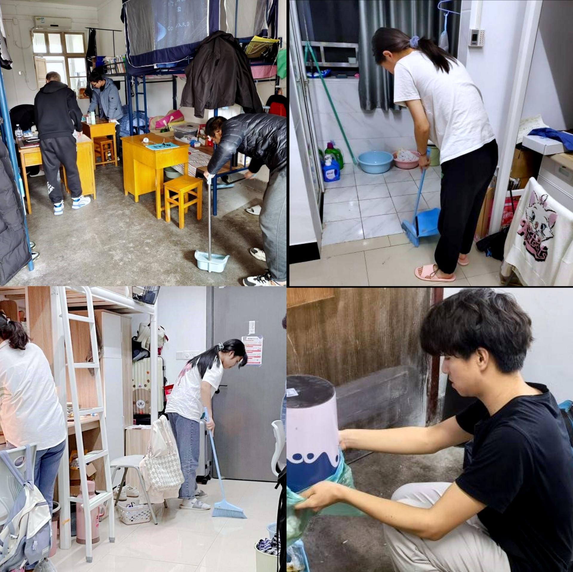 同学们认真打扫,对宿舍的死角进行清理,不放过任何一个角落,有的拿扫帚清扫地面,有的用84消毒液喷撒地面进行消毒,有的用拖把拖干净地面,力求从源头上清除病源滋生的环境,为打赢疫情防控阻击战发挥基础性作用。入党积极分子同学积极主动、认真负责的作风在打扫卫生的工作中得到了充分展现,同时也提高了自我管理、自我服务的意识。同学们纷纷表示,只要大家齐心协力,众志成城,必定能让我们的校园生活回到正轨。