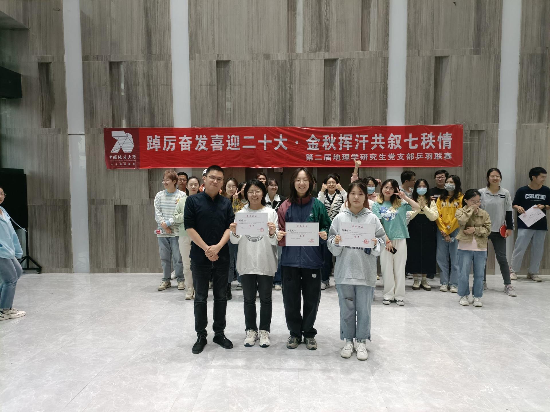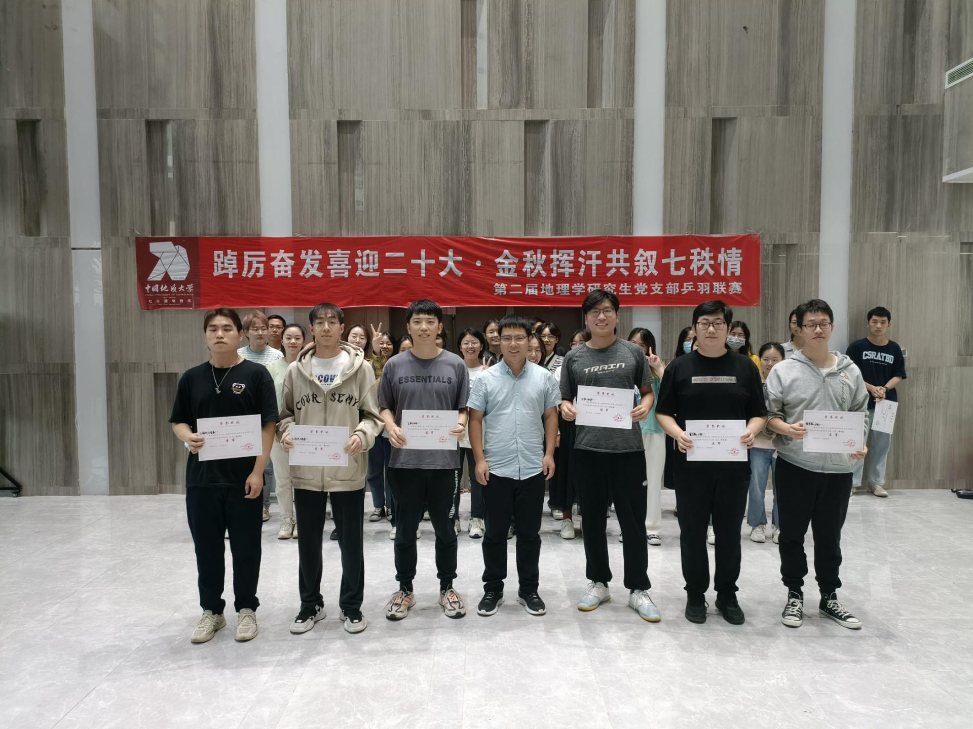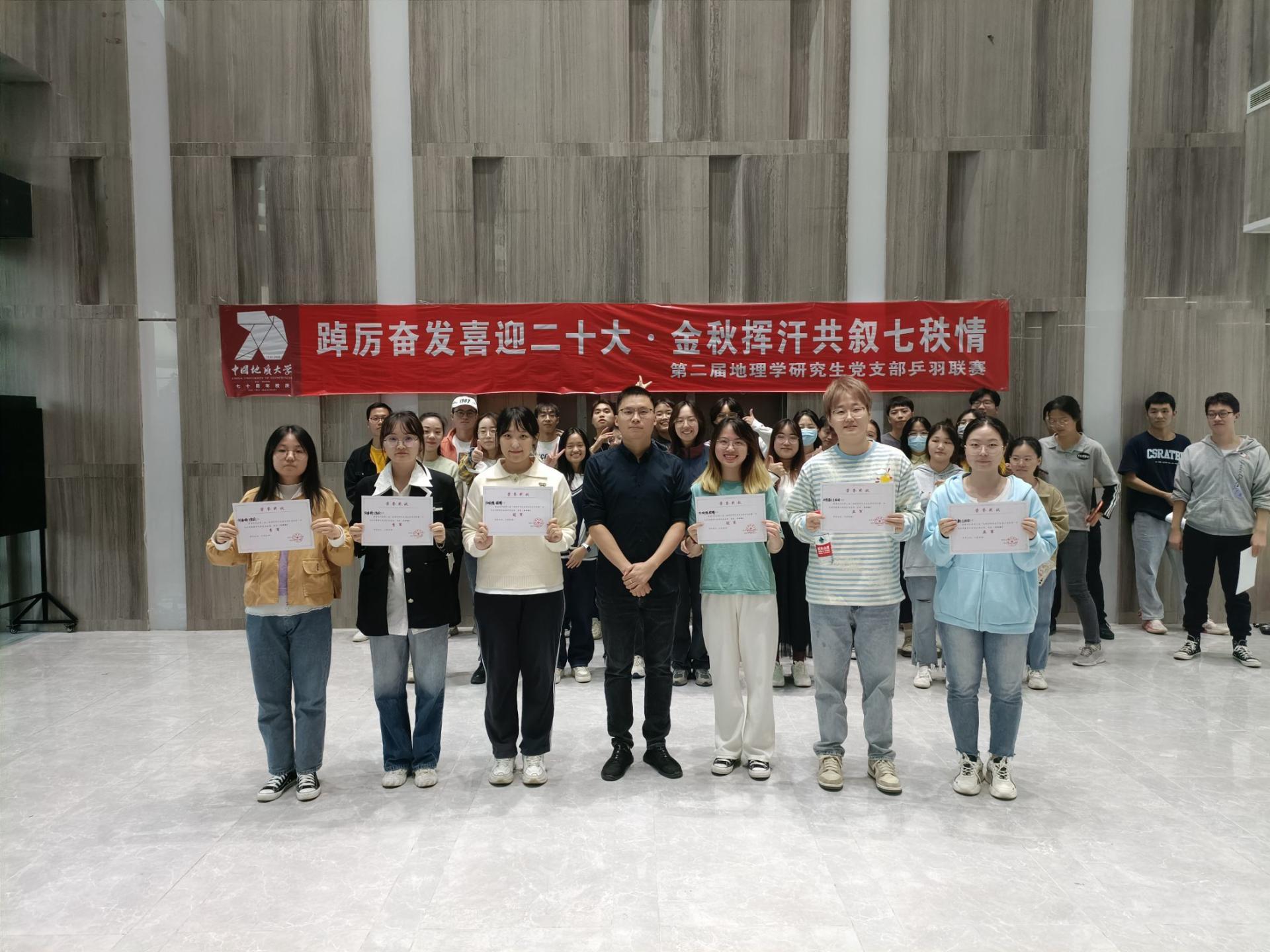 乒乓球项赛事共设立男单、女单、男双、女双、混双5个项目,参赛队伍达40队,五个项目共对阵40场。经过激烈角逐,空间规划团队党支部王凯、郭倩钰分别斩获男单、女单冠军;空间规划团队党支部王凯、张印和全球变化团队党支部任明煊、程楠分别荣获男双、女双冠军;环境遥感团队党支部黄荷、洪郁宁获得混双冠军;空间规划团队党支部荣获乒乓球项赛事团体总分第一名。刘剑宇和罗增良分别为获奖选手进行颁奖并进行合影留念。