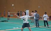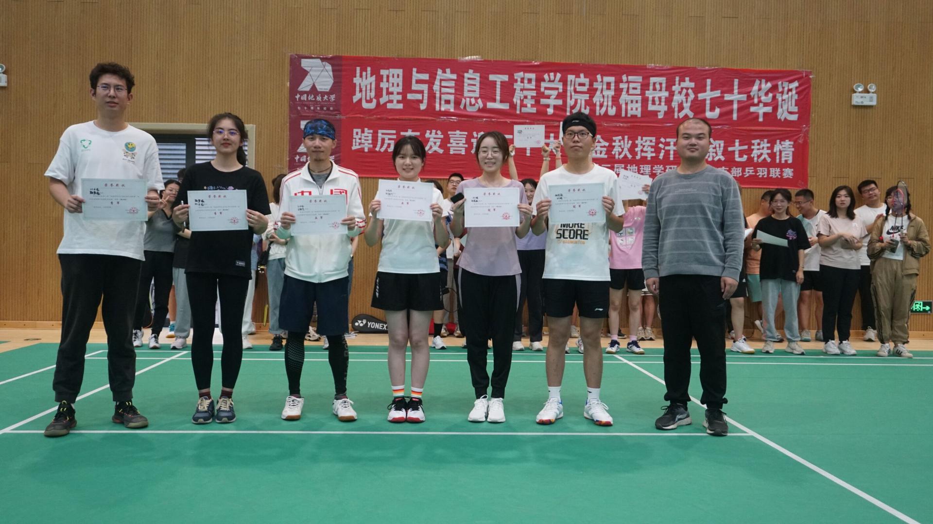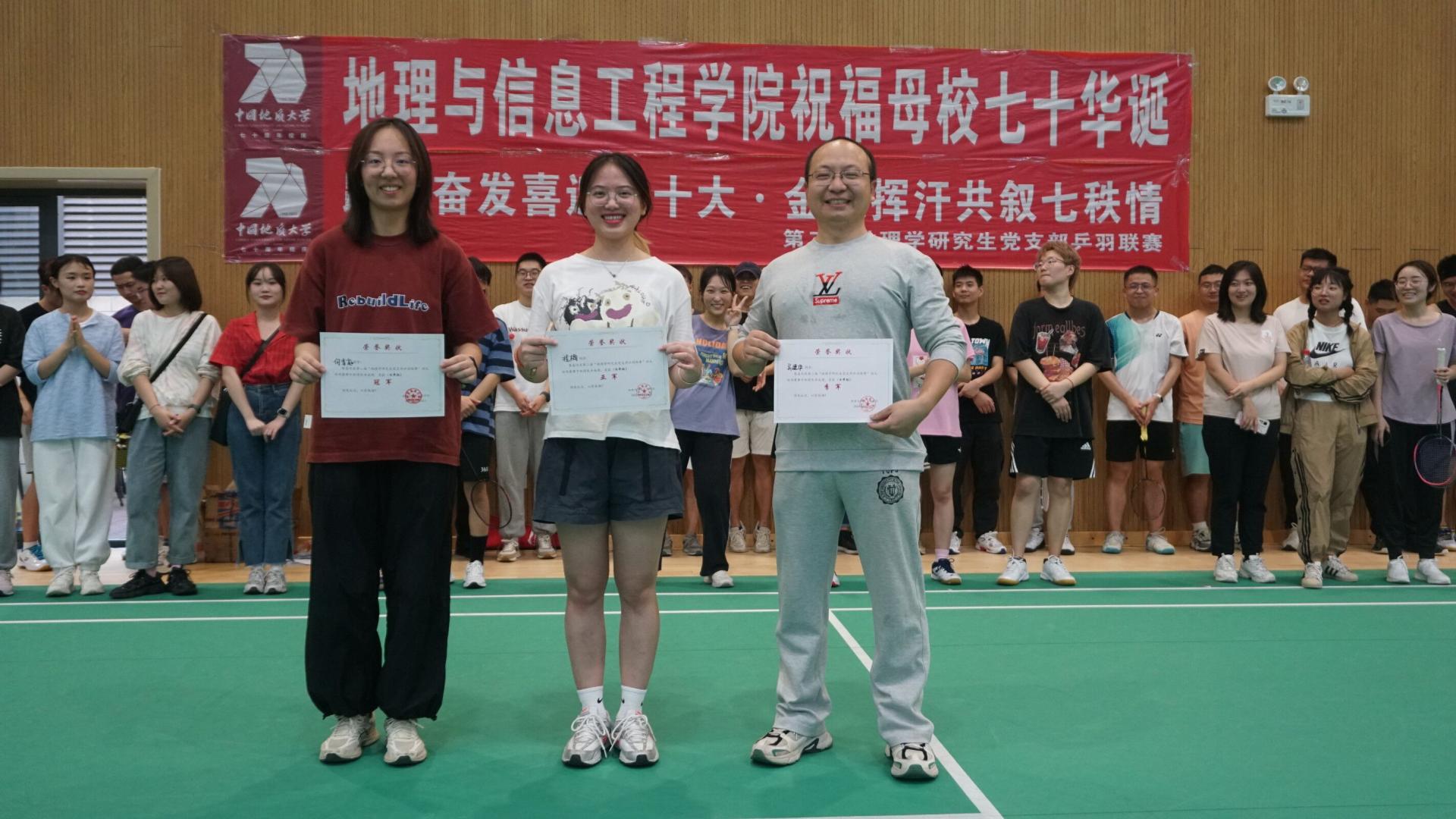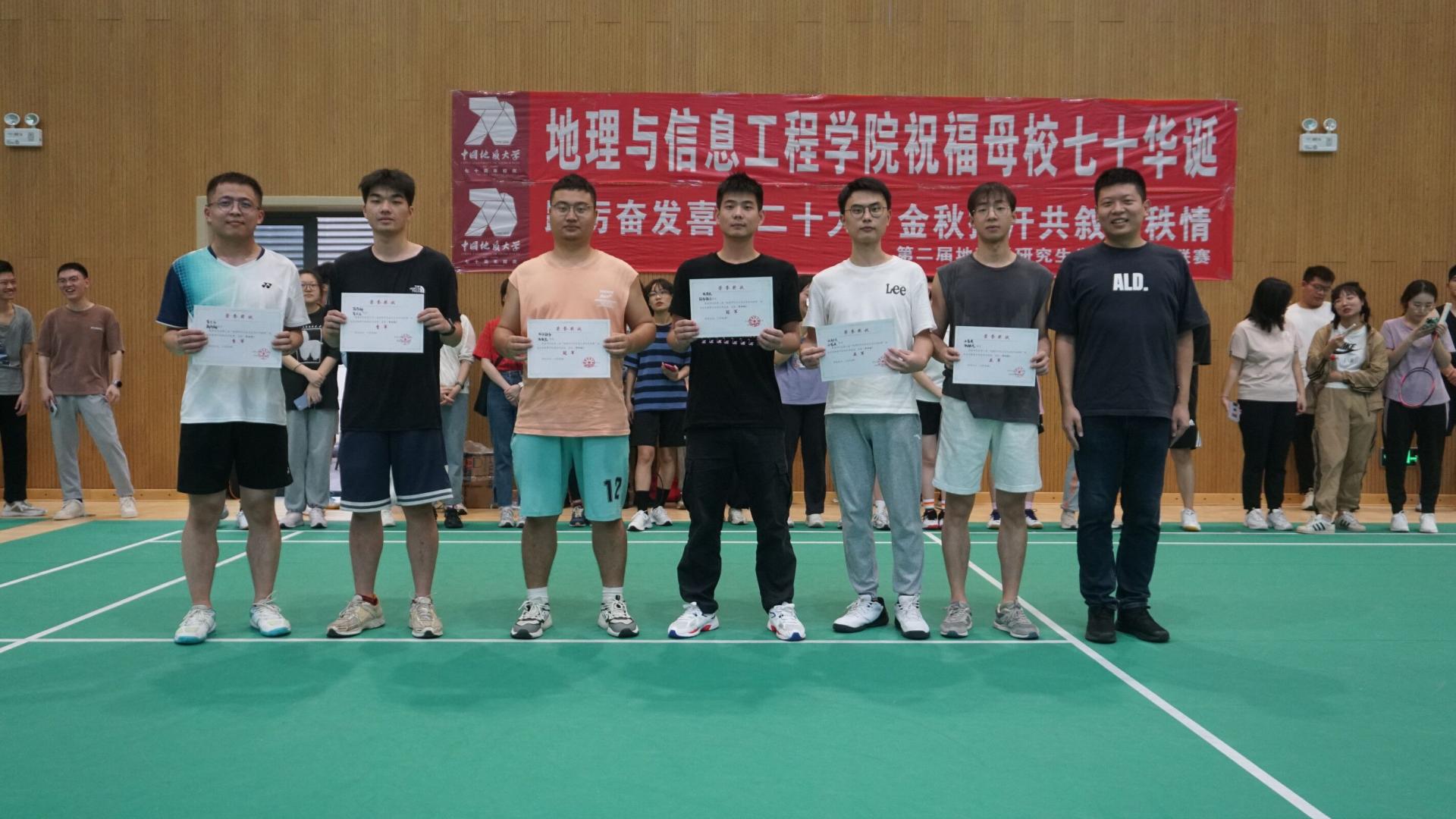 羽毛球项赛事共设立男单、女单、男双、女双、混双5个项目,参赛队伍达71队,五个项目累计对阵73场。羽毛球赛场上的气氛十分紧张,赛事也更加激烈,脱颖而出的争冠选手们各个精神饱满,激情昂扬。经过一天的鏖战,环境遥感团队党支部毛香来、空间规划团队党支部何香庭两位选手分别斩获男单、女单冠军;全球变化团队党支部陈俊宏、阿木铁布和全球变化团队党支部王小雨、邹思雅分别荣获男双、女双冠军;空间规划团队党支部孙慧敏、全球变化团队党支部刘辉取得了男女混双冠军;最终全球变化团队党支部获得了此次羽毛球团体积分第一名。王轶、王永桂、赵晓振、穆巴热克、陈涛等分别为羽毛球项冠亚季军颁发奖状并合影留念。