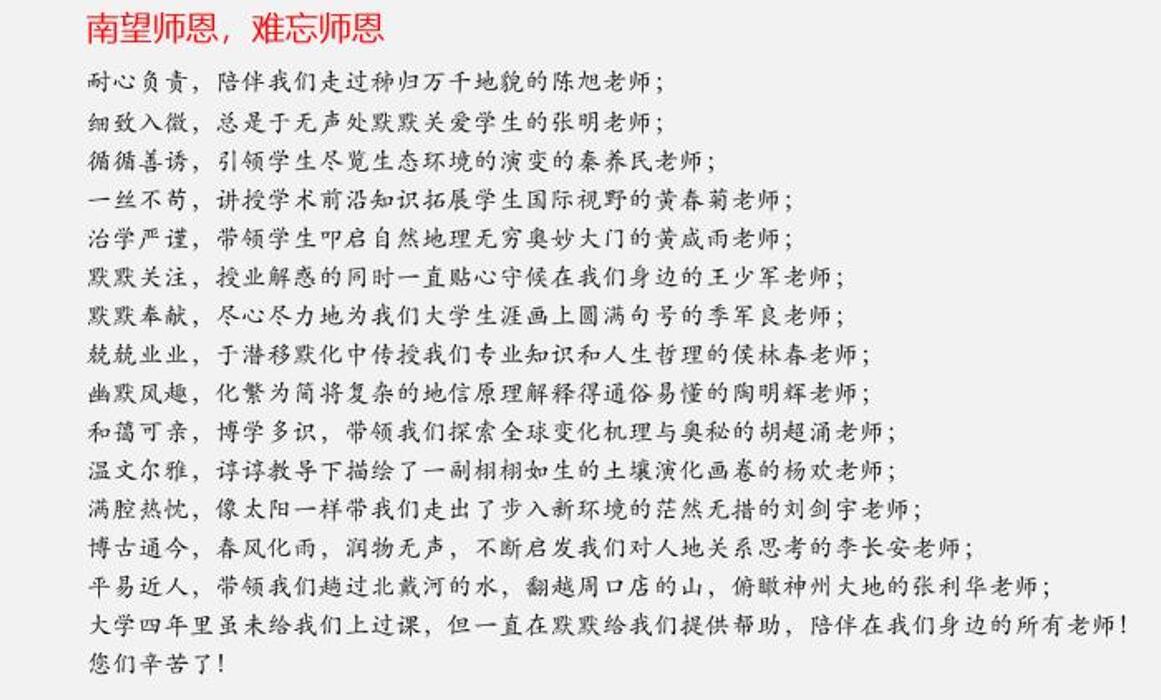 地理系副主任季军良老师对同学们的感恩之心表示赞赏,也希望大家在未来无论在哪都能保持这颗感恩之心。希望大家在随波逐流的大浪中能坚定自己的内心,无论遇到什么困难,想想在野外实习时遇到的美好风景,继续勇往直前。同时希望大家珍重大学四年以来一直陪伴在自己身边的同学们,保持联系,互相帮助。